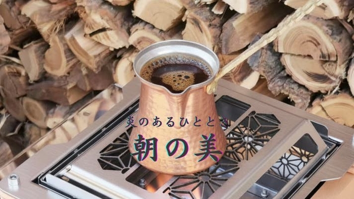 コーヒーを淹れ、炎を眺めながらゆっくりと始める朝の儀式。静かな目覚めに寄り添います。