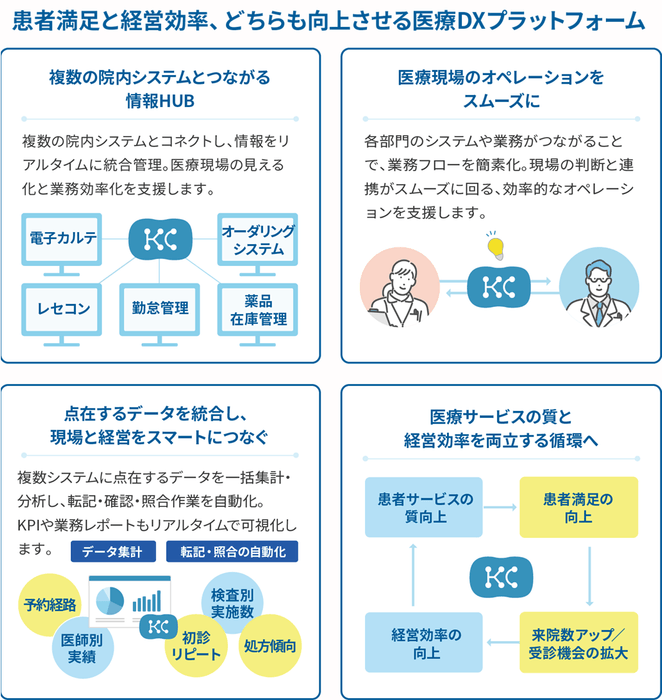 【KarteConnect】は、電子カルテ・レセコンなどのデータ活用やシステム連携によるオペレーションの効率化、患者とのコミュニケーション機会の創出などを支援し、現場におけるリソースの最適化や患者満足度の向上を実現します。