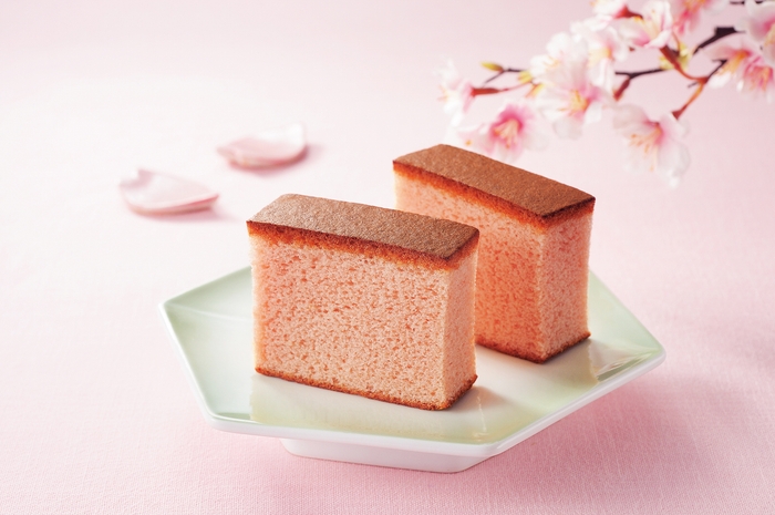 桜花ペーストを加えてふわりと焼き上げた、桜花の香り広がる桜色のカステラ。