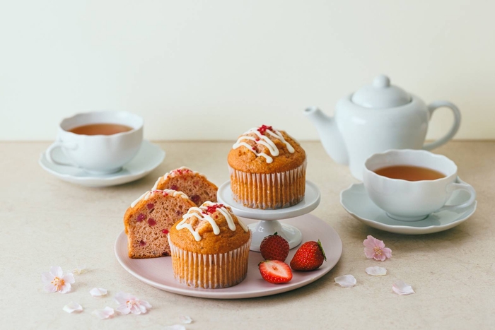 かぐわしい桜葉と甘い苺シュガーチップの味わいが調和したマフィン。