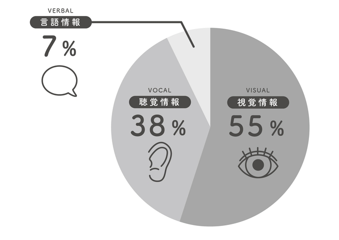 上記のように視覚情報55%、聴覚情報38%、言語情報7%と言われています。