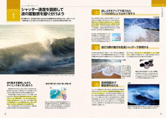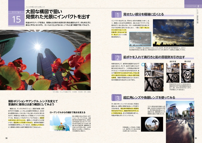 カメラ機能編では、シャッター速度やホワイトバランス、色味の仕上がり設定などの調整で撮ることが出来る14の撮影レシピを紹介。レンズ・撮影機能編では、広角/望遠/超望遠/マクロなどそれぞれのレンズならではの撮影レシピと、PLフィルター/NDフィルター/フラッシュなどを使用する23の撮影レシピを紹介しています。