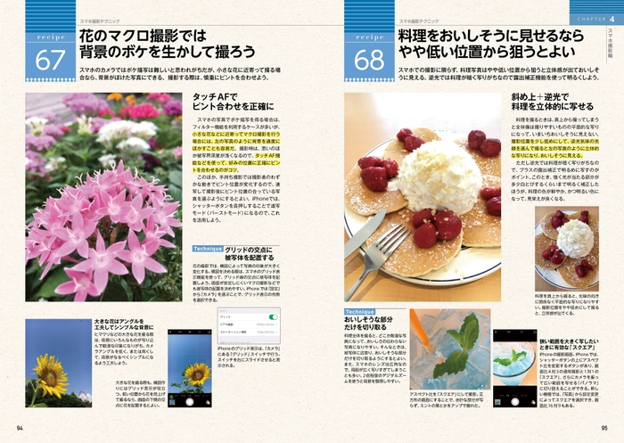 昨今のスマホは撮影機能が充実し、最も身近で手軽なカメラともいえる存在。シャッターチャンスに対する強さを活かしたスナップでの撮影レシピを中心に、流し撮りやマクロ撮影、フィルターアプリを活かした撮影レシピなどを紹介します。