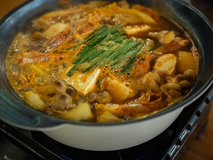 韓国風のピリッとした辛味が食欲をそそるスープに、豆腐や魚介、野菜がたっぷり。寒さを吹き飛ばすスパイシーさが魅力です。