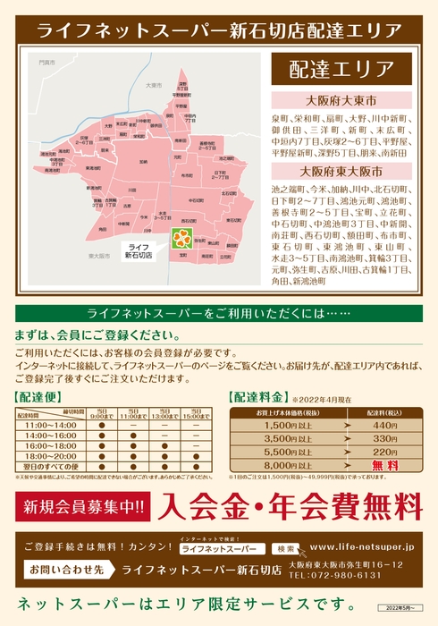 ご注文いただいた商品を店舗からご自宅へお届け「ライフネットスーパー新石切店」サービス開始 【東大阪市内の配達エリアを拡大・大東市の一部地域でもご利用可能に!】
