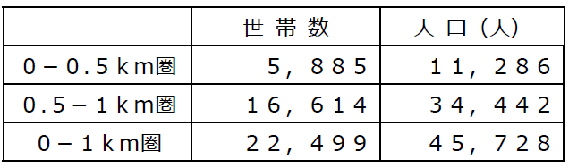 ・店舗から1㎞圏内は単身世帯比率が46.8%、2人世帯比率が24.0%と全体の7割が少人数世帯。