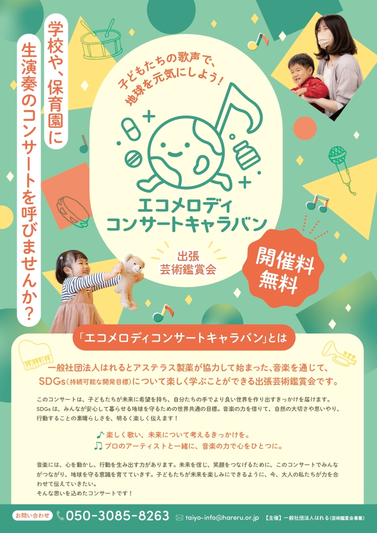 音楽や演劇、アートなどの芸術活動を通じて子どもたちに感動体験を届ける「一般社団法人はれる」(本社:千葉県柏市、代表理事:ひなたなほこ、以下「はれる」)は、2025年度よりアステラス製薬株式会社(本社:東京都中央区日本橋、代表取締役社長CEO:岡村 直樹)の協力のもと、子どもたちに生の音楽体験を通じてSDGsの大切さを伝える全国ツアー「エコメロディコンサートキャラバン」を開始します。