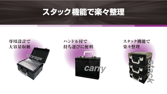 スタック機能がついているので、フルプロテクトパックボックスが増えても積み重ねが可能です。トレーディングカードのコレクションが増えても、整理・保管が楽にできます。