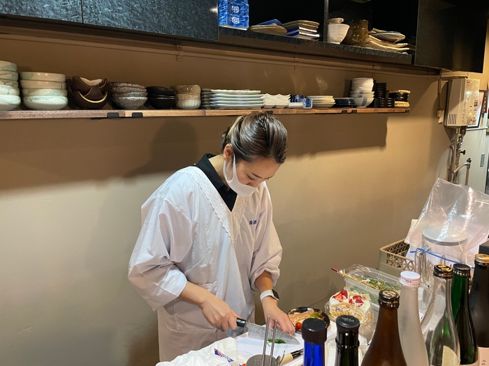 間借り営業していた店舗をそのままお借りして実店舗オープンした割烹着姿の菜穂さん。