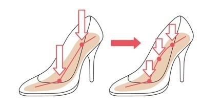 写真上:従来の2点で荷重がかかるパンプスと、3点で荷重を支えて負担を分散させるmetaインソール搭載パンプスの図