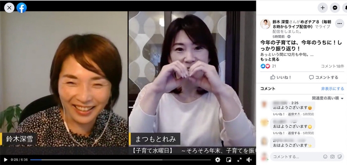 オンライン上で「子どもが教える学校」の校長で小2男児の母である「鈴木深雪(すずきみゆき)」さんと、ワーママ歴13年で中1小5男子&小3女子三児の母としてワーママCafe主宰する「まつもとれみ」さんが、日本最大規模の朝活オンラインサロン「めざチア」に出演中!毎週水曜朝8時から配信される子育てをテーマにしたライブは「共感します!」「子育てが楽しくなります!」と子育て中の女性視聴者から大反響です。