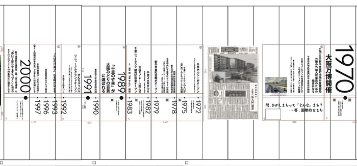 デザインは、卒業論文で「工事中景」をテーマに研究している鈴木ゼミ4年生の関谷 百花さんが担当しました。千里の歴史と現状について蓄積してきたディスカバー千里とのディスカッションで、均質だとみなされがちなニュータウンの各住区にもそれぞれの個性や歴史があること、またその歴史が必ずしも新旧住民の間で共有されていないことが浮かび上がりました。それに着目し、「ひがしまちって『どんな』まち?展」と題して、新千里東町の特徴と魅力を写真で表現しつつ、千里ニュータウンの歴史と思い出を約30mにわたる年表の形式でデザインしました。