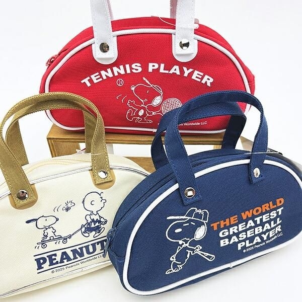 今回ご紹介するのは、昭和の時代に流行したスポーツバッグをミニサイズで再現したレトロバッグ型ポーチです。見た目レトロ可愛いポーチにスヌーピーのイラストをプラスしたアイテムで、レッド・ネイビー・グリーンといった鮮やかな5色のカラーがラインナップ。それぞれ異なるスヌーピーたちの愛らしい姿がデザインされておりますので、全種じっくりご覧になってくださいね。\