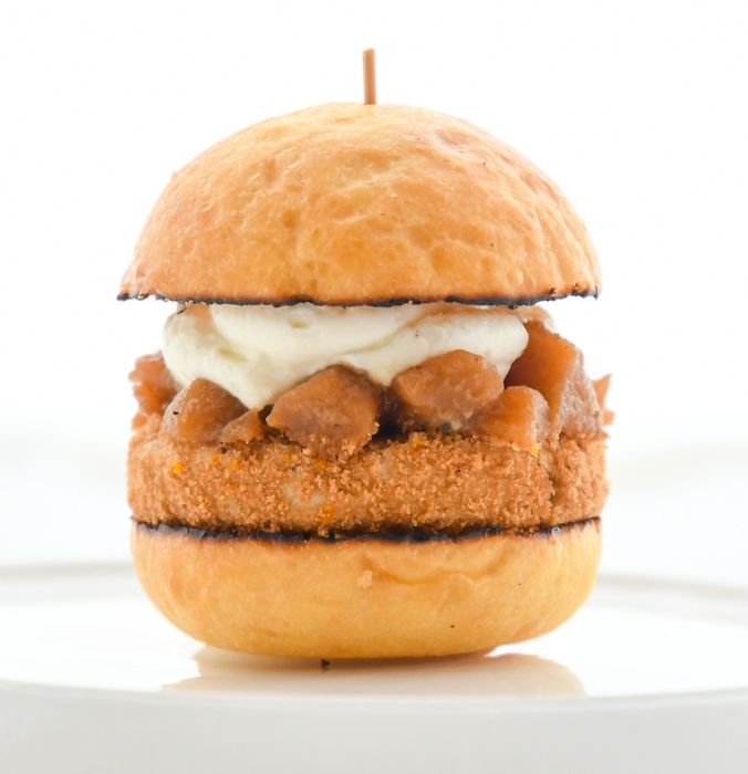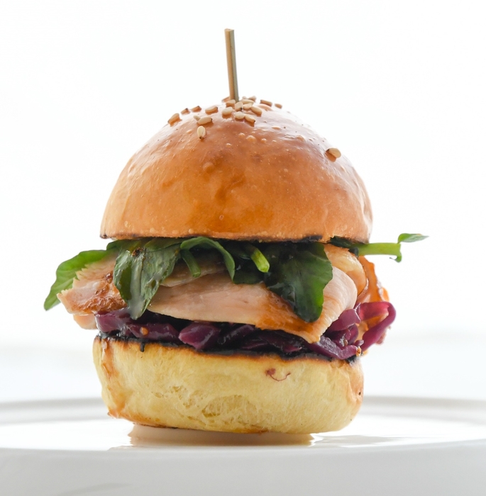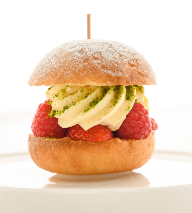 ブリオッシュバンズに、苺とクリームをサンド。クラシカルなフランス菓子風に仕上げたデザートスライダー。クリームの程よい甘さ、種(ぺパン)のツブツブ食感が楽しいフランボワーズジャム、苺や木苺の酸味のバランスが絶妙。コースのしめくくりに相応しい爽やかなデザートです。