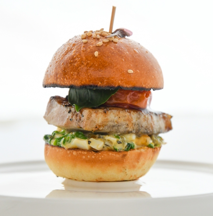 旬の春野菜とメカジキの組み合わせを楽しむスライダー。ローズマリーやオリーブ油でマリネし、炭火で香ばしく焼いたメカジキのジューシーな旨味に菜の花のタルタルが春を感じさせてくれます。バンズには桜の漬けをあしらって華やかに。