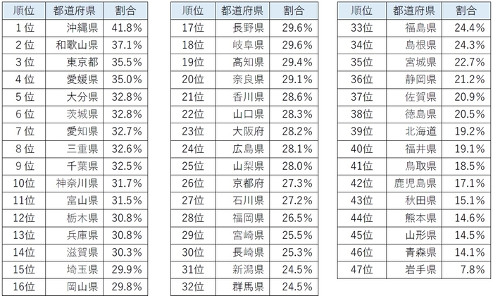 都道府県別で最も⾼い数値を⽰したのは沖縄県の41.8%で、反対に、最も低かったのは岩⼿県の7.8%でした。トップと最下位の差は5倍以上という結果になっています。