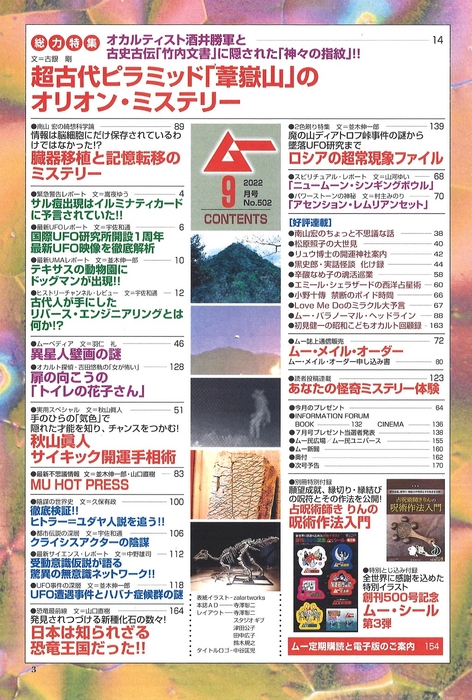 特別企画 臓器移植と記憶転移のミステリー/国際UFO研究所開設1周年/実用スペシャル 秋山眞人 サイキック開運手相術/別冊特別付録 占術師き りんの呪術作法入門/特別とじ込み付録 創刊500号記念ムー・シール第3弾/サル痘出現はイルミナティ・カードに予言されていた‼/徹底検証‼ ヒトラー=ユダヤ人説を追う‼ ほか