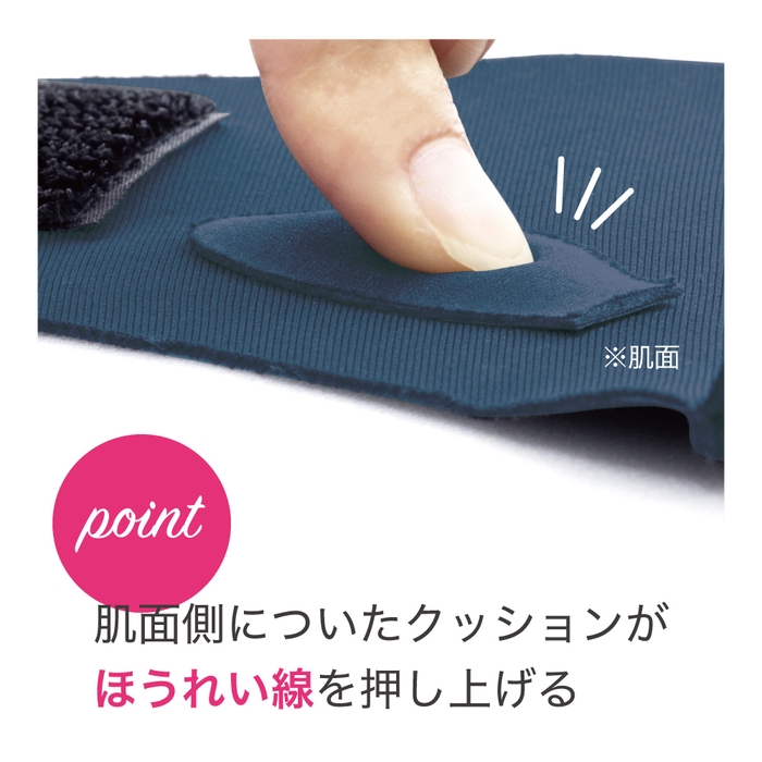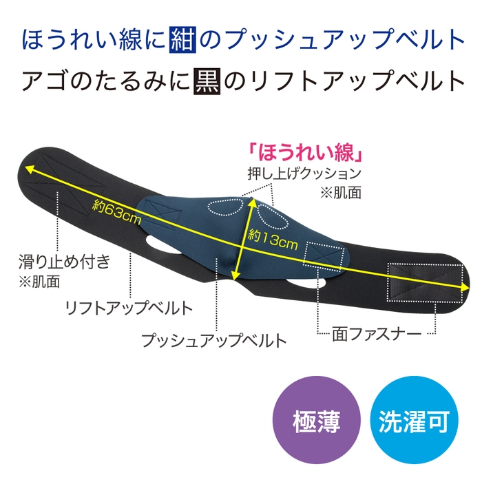 紺:ほうれい線に向けた紺のプッシュアップベルトは肌面にほうれい線押し上げクッションが付いていてしっかり支えてくれます。