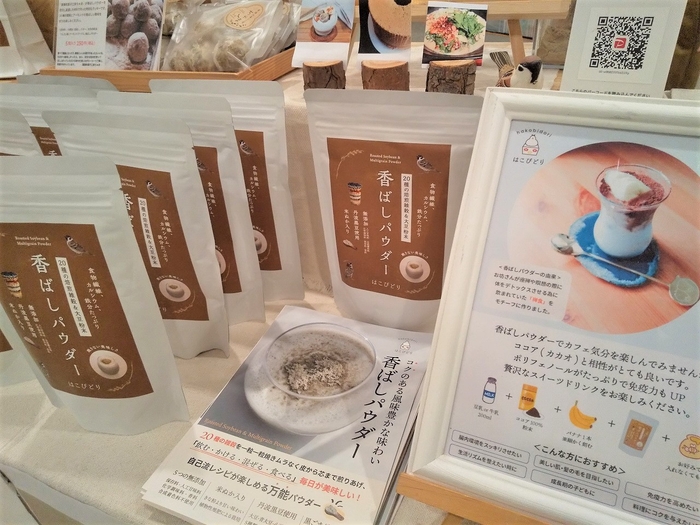 ●はこびどり(北海道の大豆と丹波黒豆、米ぬか、黒ごまなど20種類をオリジナルブレンドした「焙煎大豆&雑穀粉末」)