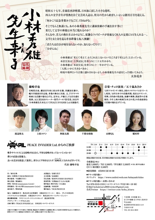PEACE INVADER Ltd.・合同会社ハルベリーオフィス 企画製作、PEACE INVADER Ltd. Vol.1『小林秀雄先生来る』が2022年7月1日(金)〜10日(日)に下北沢駅前劇場(東京都世田谷区)にて上演されます。チケットはカンフェティ(運営:ロングランプランニング株式会社、東京都新宿区、代表取締役:榑松 大剛)にて4月29日(金)10:00より発売中です。