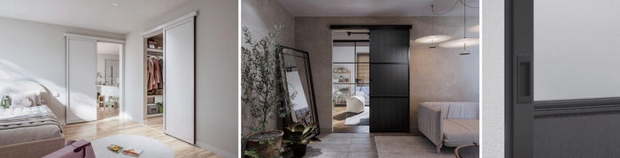 従来の天井付け仕様に加え、壁面にしか下地がない場合に対応可能な『正面付け』が登場。出入口扉、キッチン収納、クローゼットの目隠しなどにご使用いただけます。意匠性を高めるコンパクトなレールカバーは、ホワイトとブラックをご用意。オプションの『ソフトクローズ機能』は、勢いよくパネルを動かしてもゆっくりと静かに閉まり、指の挟み込みやパネルの衝突音を防止します。