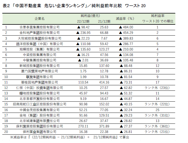 表2 「中国不動産業 危ない企業ランキング」/純利益前年比較 ワースト20