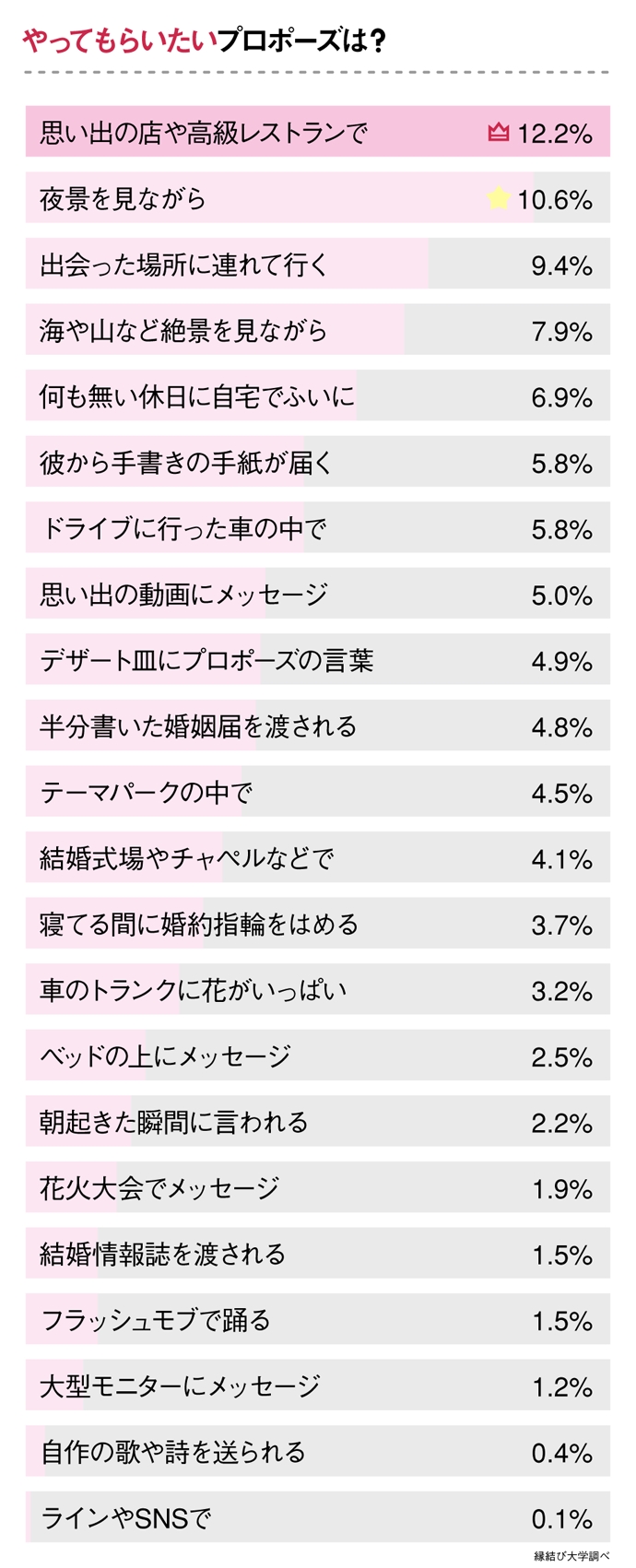「夜景を見ながら」「出会った場所に連れて行く」は、NGだという回答はゼロでした。この2つは確実に間違いないプロポーズの方法と言えます。