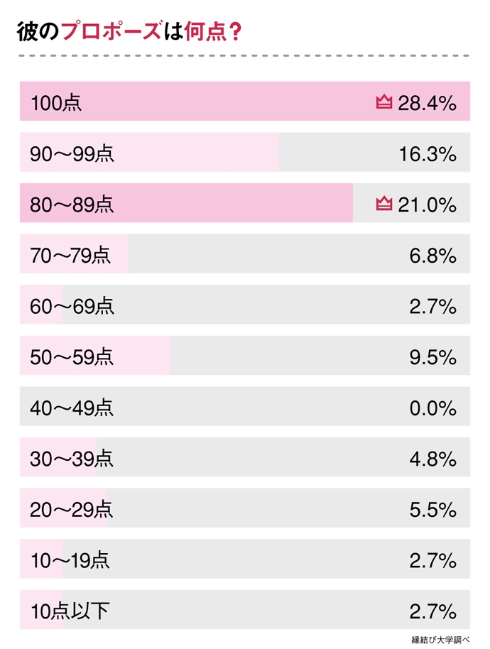 相手男性からのプロポーズについて女性の評価を聞いたところ、100点満点が28.4%で最も多い結果となりました。次点は80点台で、21%でした。ボリュームゾーンは91~100点で、女性の受け止め方は男性の自己採点よりも評価が高いことが分かりました。
