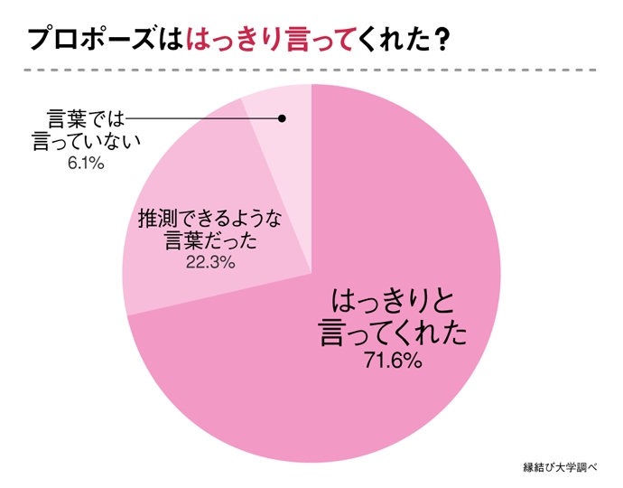 今回のアンケートでは、プロポーズされた女性側にも調査しました。プロポーズの言葉を「はっきりと言ってくれた」と受け止めたのは、71.6%です。誤差はあるものの、この部分は男性の回答(はっきりと伝えた69.9%)とも一致しています。