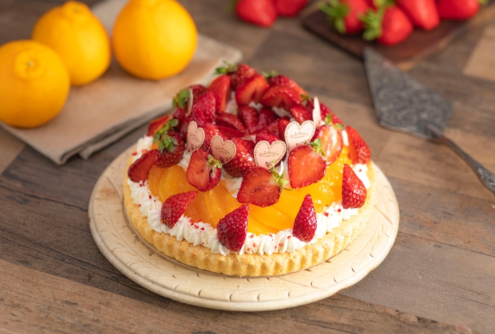 カスタードタルトに優しい甘さのミルククリームといちごクリームを重ねました。みずみずしい不知火と甘酸っぱいあまおうを贅沢に飾りました。