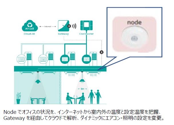 「AIrux8」は、人感センサーを組み込んだ「Node(ノード)」と呼ばれる集中コントローラー装置を通して、施設内の混雑状況や不在状況等のデータを取得し、AIで解析します。そして状況に応じて、施設内に設置されたIoT照明設備と通信し、各照明のエリアグループ毎に時間帯、営業稼働日、季節により照明の明るさを自動制御します。