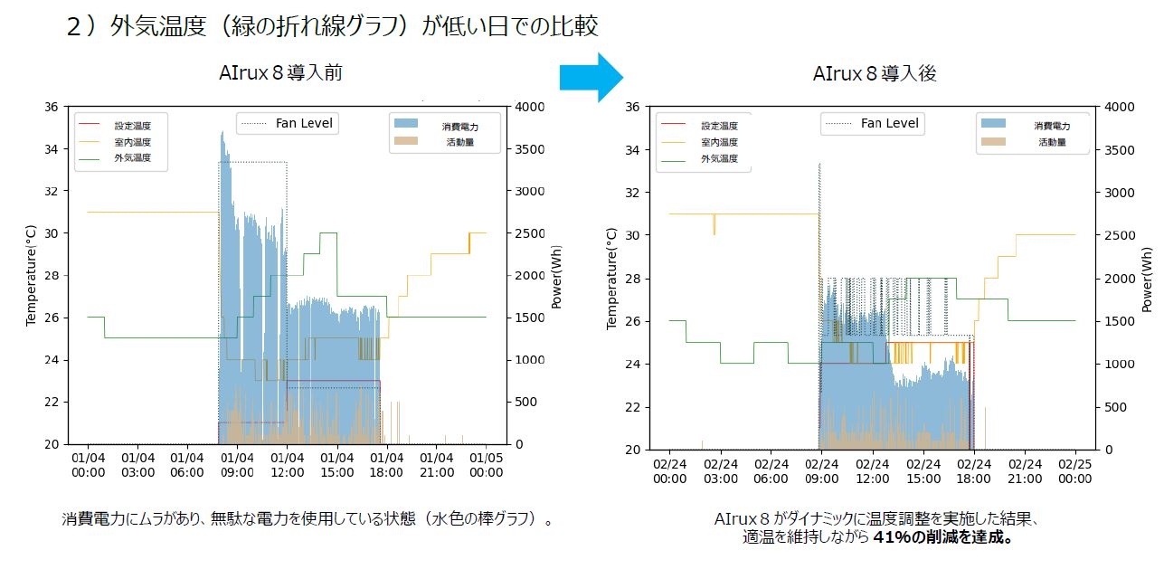 このように、「AIrux8」は、照明やエアコンを実状況に合わせて適正値に自動制御することで、施設内のエネルギーコストを41%削減した実績があります。