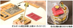 オルゴール職人のサポートのもと、自分だけの音色のオルゴール作りが体験できます。お好みの曲、ケース、コース(一般コース、上級コース)を選んで、完成したオルゴールは持ち帰りできます。下記日程は、特設のこたつ席(1台、先着順)で、あたたまりながらじっくり体験できます。冬にお薦めの飾りつけ小物もご用意しています。
