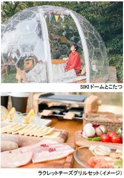 「SIKIドーム」とは、まるで屋外にいるかのような気分を味わえる360度透明のドームです。当プランでは、六甲山の冬の景色を眺めながらこたつの中であたたかくお過ごしいただけます。また、食材をグリルし、あたためたチーズをかけて食べる「ラクレットチーズグリルセット」(当プラン限定メニュー)も併せて楽しめます。