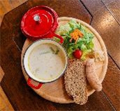 ドイツの「ケーゼズッペ」と呼ばれるチーズスープとソーセージ、パン、ザワークラウト、サラダをワンプレートにしたドイツ風プレートです。チーズ、ブロッコリー、ジャガイモ、ベーコンが入ったクリーム系のチーズスープは、パンに合う濃厚な味わいです。