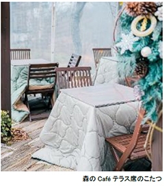 コンサートルーム、森のCafe(※1)テラス席、オルゴール組立体験部屋、ツリーハウス、SIKIドームなど施設内の至る所にこたつを設置する他、併設の森のCafe(※1)では期間限定のあったかメニューを提供します。