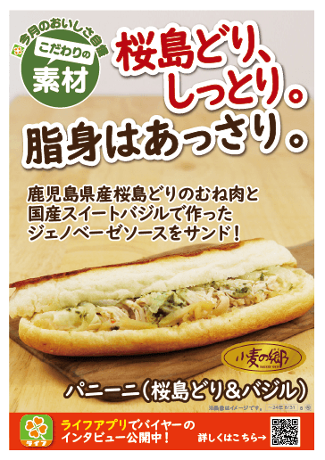 ”小麦の郷”からは、鹿児島県産の銘柄どり「桜島どり」のむね肉とジェノベーゼソースで、暑い夏でもさっぱりと食べられる「パニーニ」を発売いたします。