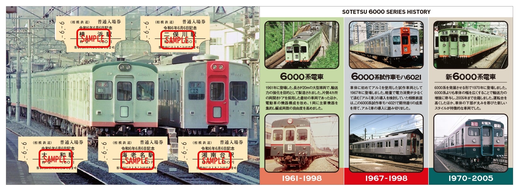記念入場券の中面には「6」にちなみ、昭和・平成の相鉄線を駆け抜けた「6000系」電車(1961年に登場)と「6000系試作車モハ6021」電車(1967年に登場)、そして「新6000系」電車(1970年に登場)の紹介文が記載されています。また表紙は、平成6年6月6日当時に乗務員などが携帯していた、相鉄いずみ野線 いずみ中央駅が終点の「列車運行図表(ダイヤ図)」をモチーフにしたデザインとしています。