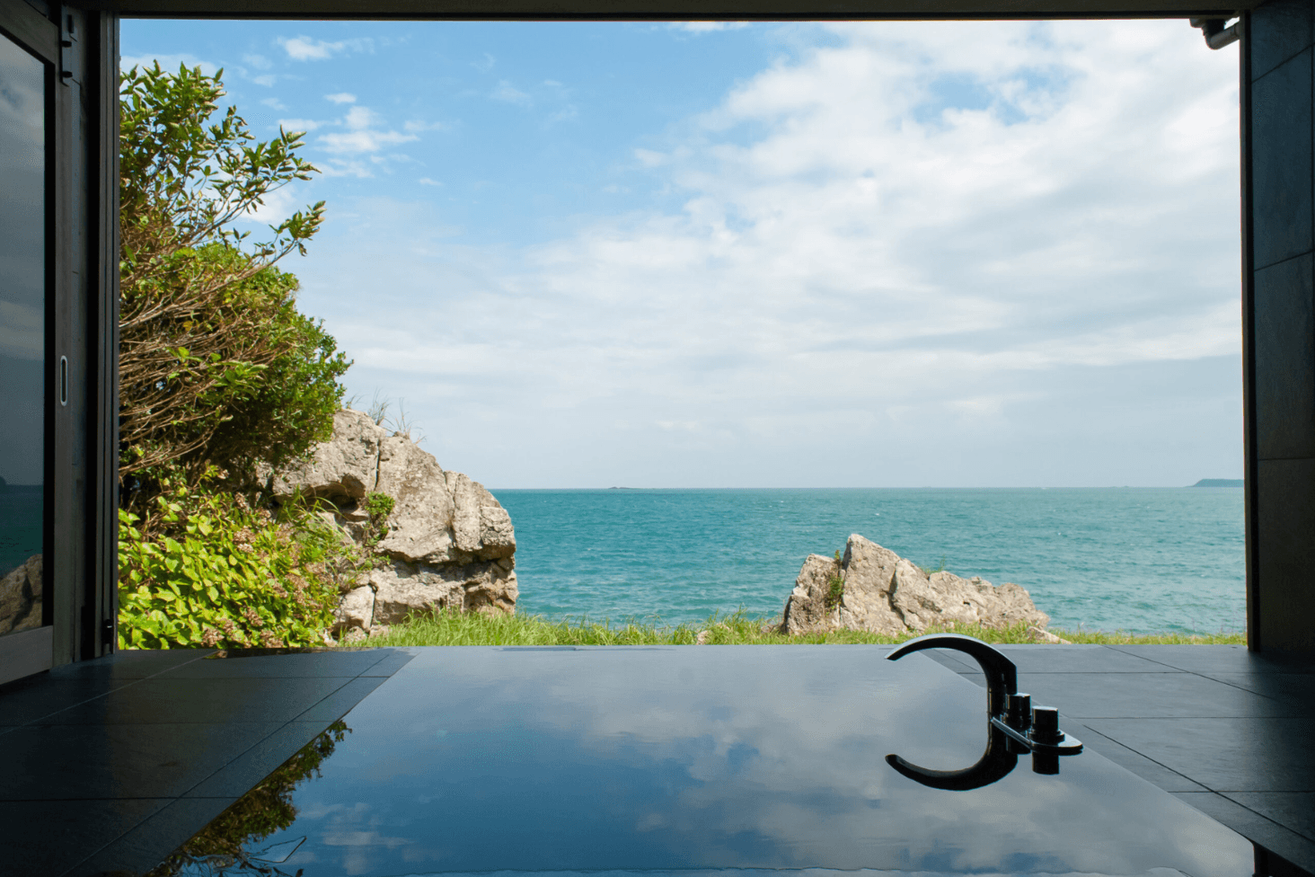 橋杭岩近くの温泉「弘法湯」での貸切露天風呂からの観覧。オーシャンビューの半露天風呂で海を眺めながら、リラックスした状態でロケットの打上げを楽しめます。太平洋とともに味わう贅沢な時間をお過ごしください。