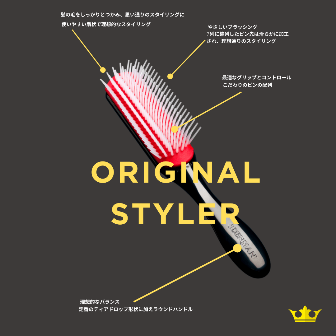 *デンマン インターナショナル=1938年、英国創業。創始者、ジャック・デンマン・ディーンが、ラバーパット(ゴム)に硬く細いナイロンピンを埋め込むハーフラウンドブラシを開発。60年代に、故ヴィダル・サスーンがデンマン D3 トラディショナル ブローブラシ(=現・D3オリジナルスタイラー)を使い、マリー・クヮントのアシメトリーボブスタイルに代表されるサスーンカットを発表し、世界中に旋風を起こします。故ヴィダル・サスーン氏は「デンマンブラシを使わずしてカットの完成はなかった」と語り、デンマンは、美容師が愛用するブローブラシの代名詞として地位を確立。現在もポール・スタッフォードやマーク・ウーリーを始めとする国際的な評価を得ているヘアアーティストが、今もデンマンブラシを使って、斬新で刺激的なスタイルを創造しています。