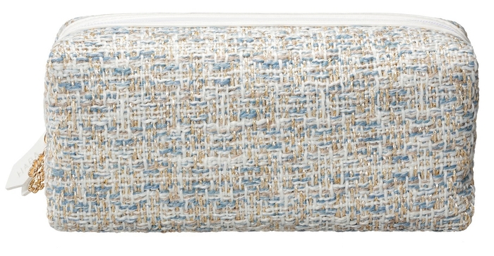 高級感のあるツイード生地で仕立てたポーチ。金の色糸を使用した華やかなツイード生地に、ファスナーにはコレクションのテーマ『パピヨン』をモチーフにしたチャーム付き。内側には小物の仕分けに便利なポケット付きで、使いやすさにもこだわりました。