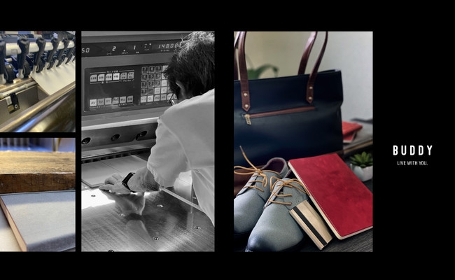 BUDDYとは、当社で製作しているリングレス(金属リングの無い)ノートで、ふわふわした手ざわりを持つ特殊加工紙(ケースボード、ウーペ)や、書籍用紙など、既製のノートではなかなかお目にかかれない紙が採用されています。デジタルが主流な時代にあえて、紙そのものの知られざる魅力を新たに感じて欲しいとの願いを込めて製作されています。