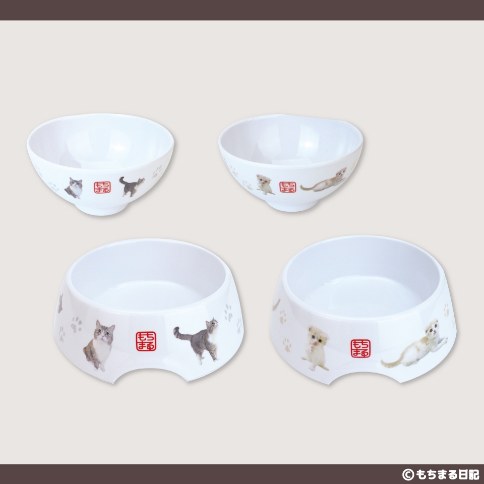 もちまる・はなまるがそれぞれプリントされていて、お茶碗とフードボウルがセットになっています。