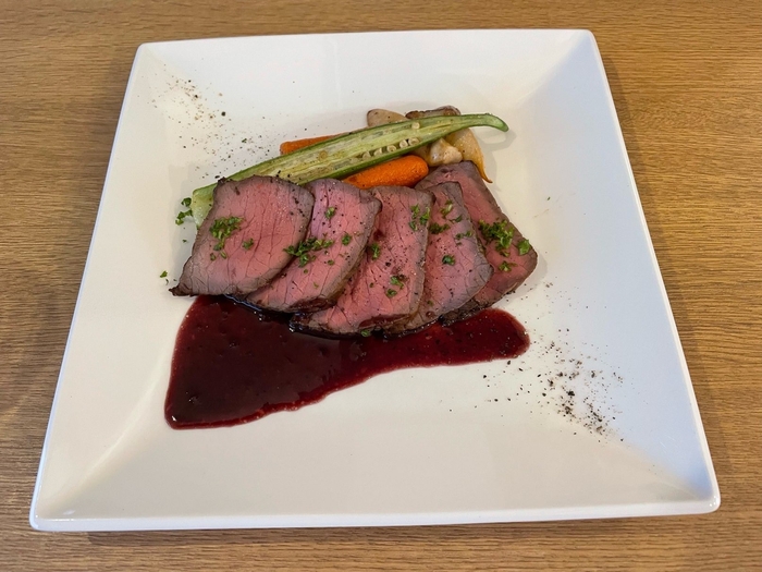 お肉の切れ味が柔らかく口の中で赤ワインソースと肉汁が広がりナイフとフォークが止まりません。夏野菜のソテーはご主人自ら買付に行って厳選したもの。オクラ、人参、エリンギが名脇役としてローストビーフを引き立てます。
