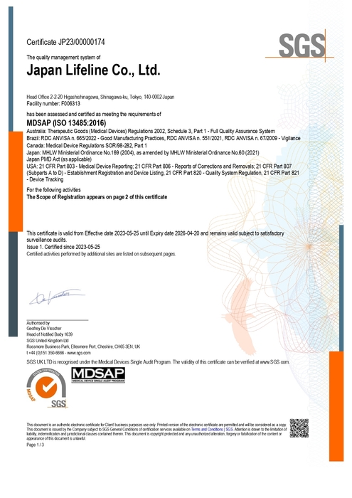 日本ライフライン株式会社(東京都品川区、代表取締役社長:鈴木 啓介、事業内容:医療用機器輸入・製造および販売)は、医療機器における品質マネジメントシステムの国際規格MDSAP(Medical Device Single Audit Program)の認証を、2023年5月25日(木)に取得いたしました。