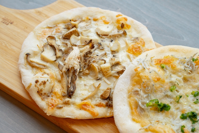 ・しらすとネギのピザ、いろいろキノコのピザ
