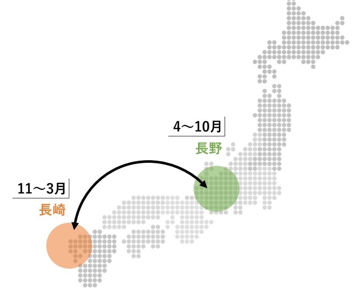本取り組みは、当社がベトナム人材を昨年2021年4~10月の繁忙期に長野県の農家に紹介し、その期間中、農業特定技能試験の合格支援を行った上で、長野県の閑散期が始まる11月より繁忙期となる長崎県の就労先農家を紹介、さらに今春再度長野県にUターンできるよう支援する就農プログラムです。