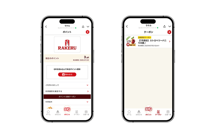 本アプリはラケルが展開するレストランで利用できる会員向けアプリです。本アプリでお店にあるQRコードを読み込むと、来店ポイントや購買金額に応じたポイントが付与され、貯まったポイントはポイント交換クーポンに引き換えて利用することができます。またホーム画面からはお店のグランドメニューやオンラインショップにアクセスできるように設計しています。本アプリ導入により、ユーザーの利便性向上や再来店促進が期待されています。