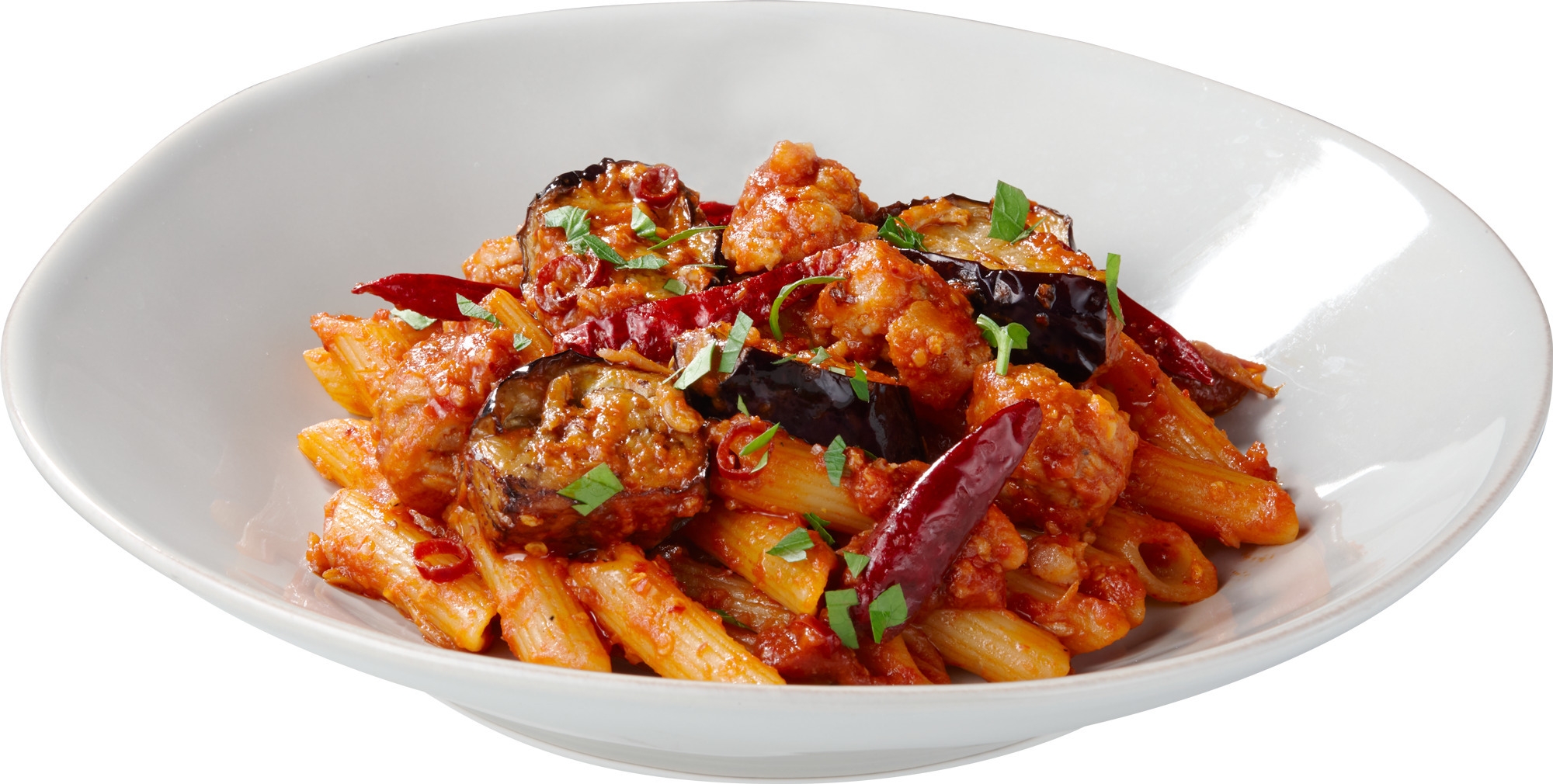 ・自家製ハーブサルシッチャと揚げナスの激辛トマトソースペンネ ¥1,518 Spicy Level ★★★