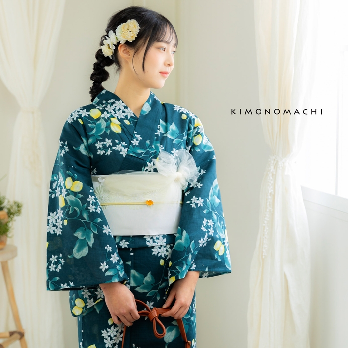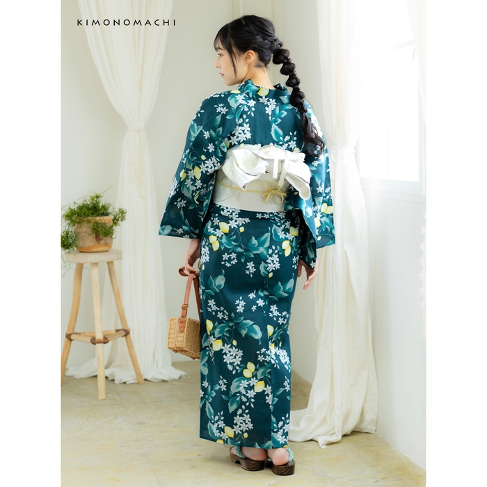 甘くなりすぎないデザインが大人の女性に人気の「檸檬」の浴衣。既存の色はナチュラルな雰囲気のサンドベージュ、トレンドのくすみカラーのブルーグレー。今回、新たに加わったのは人気色のクロムグリーンです。深い緑の地に明るい檸檬が清新な印象です。